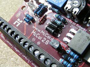 Hier seht Ihr den ersten Prototypen des McCoi 2.6 fertig zusammen-gelötet. Der Bestückungsdruck auf der Platine macht den Aufbau sehr einfach. MIt einem Multimeter und der Farbcodetabelle der Einbaudoku könnt Ihr den Wert der Widerstände leicht bestimmen. Die übrigen Bauteile ergeben sich dann schon fast automatisch... Alles sehr einfach! |